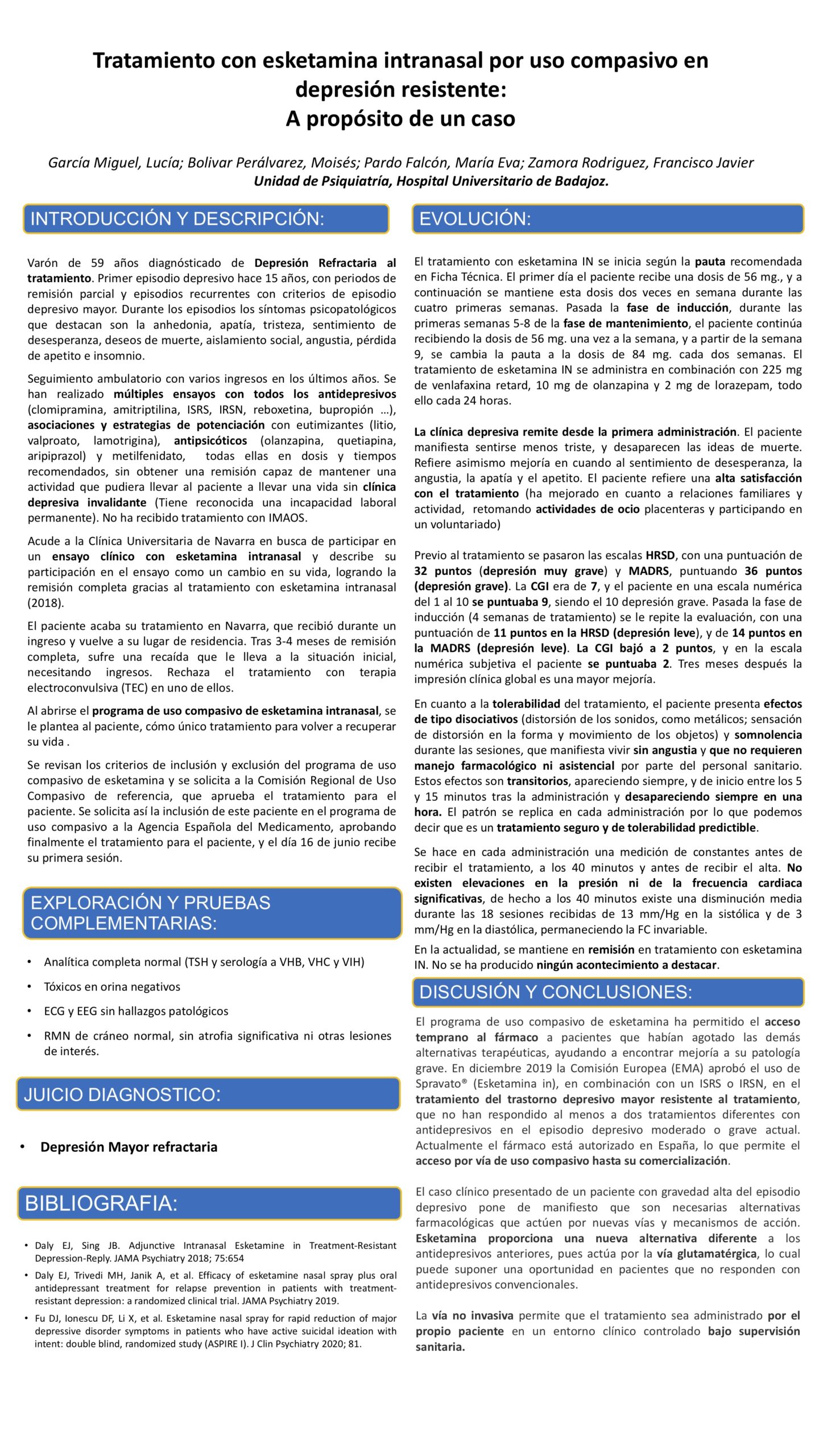 Introducción: los trastornos depresivos suponen la mayor causa de discapacidad mundial (mayor número de bajas laborales y costes asociados) y un riesgo de suicidio 20 veces superior que la población general. La depresión resistente se define como el fallo de al menos 2 antidepresivos diferentes, con una dosis, duración y adherencia adecuadas. Para ello, se ha desarrolla un nuevo tratamiento, la esketamina intranasal (antagonista del receptor NMDA),que ha demostrado su eficacia y seguridad (la vía intranasal permite la liberación del fármaco directamente al sistema nervioso central, con un rápido inicio de acción y minimización de efectos secundarios sistémicos). En este contexto, a finales de 2019, comenzó la pandemia mundial del COVID-19 que ha supuesto un gran impacto económico, laboral, pero sobre todo, social y psicológico (niveles elevados de síntomas depresivos, ansiosos, insomnio y mayor riesgo de suicidio).